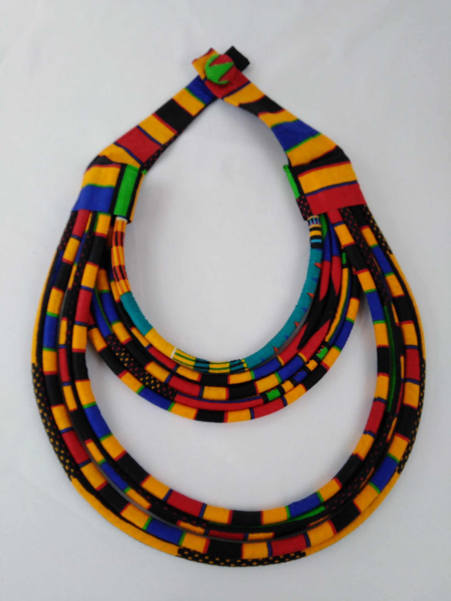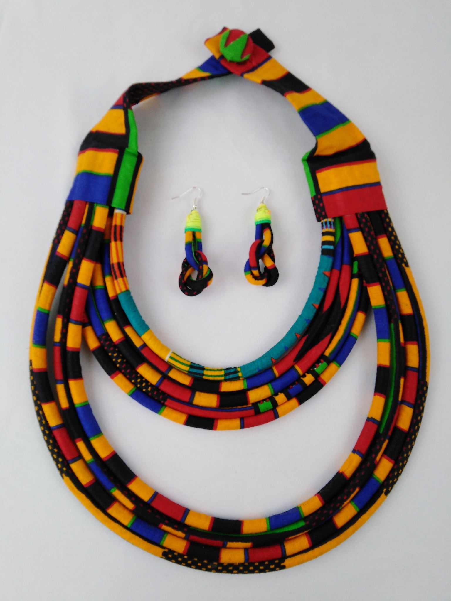 Statement necklace and earrings made of African wax print. Large braid design.